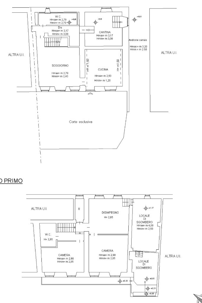 Al piano superiore, la disposizione consente la realizzazione di fino a tre camere da letto, di cui una con bagno privato completo di doccia. Presente anche un locale di sgombero, adatto come cabina armadio, studio o zona hobby. Completano il piano un balcone con affaccio sul cortile interno e un terrazzo coperto, ideale per un momento di relax all’aperto.